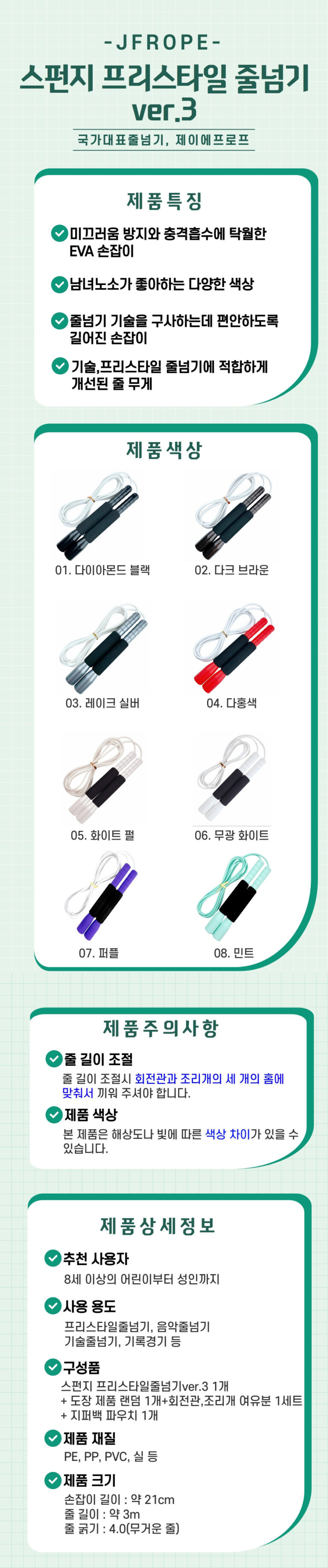 제이에프로프 스펀지 프리스타일 스피드줄넘기 ver3 판매가격39,000원제품번호프리미엄 스펀지 프리스타일 줄넘기 21cm배송비무료배송브랜드JFROPE제조사/원산지JFROPE/대한민국 구매하기 상세설명