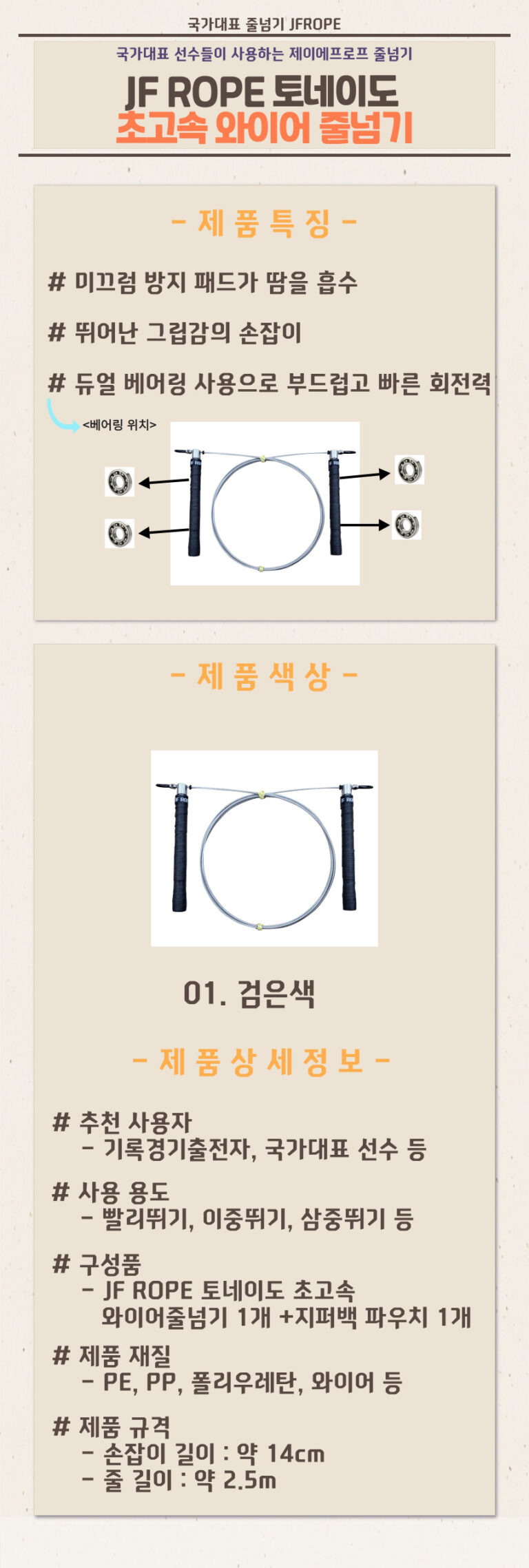 제이에프로프 선수용 토네이도 프리미엄 초고속 와이어 줄넘기 판매가격90,000원제품번호선수용 토네이도 프리미엄 초고속 와이어 줄넘기배송비무료배송브랜드JFROPE제조사/원산지JFROPE/대한민국 구매하기 상세설명